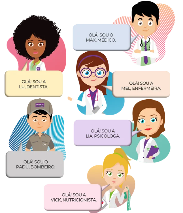 Com isso, criamos nossos mascotes representados por Profissionais da área da saúde e segurança que são presentes em todo o material e que conduzem o aluno para diversos conteúdos, dicas, curiosidades e conceitos.